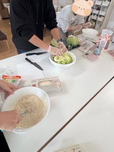 キャベツを刻む担当、生地を作る担当に分かれて作業開始です。